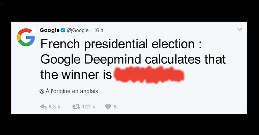 Dans un tweet généré automatiquement, DeepMind, l’intelligence artificielle développée par Google Labs, vient de révéler au monde entier le nom du futur président de la République française.
